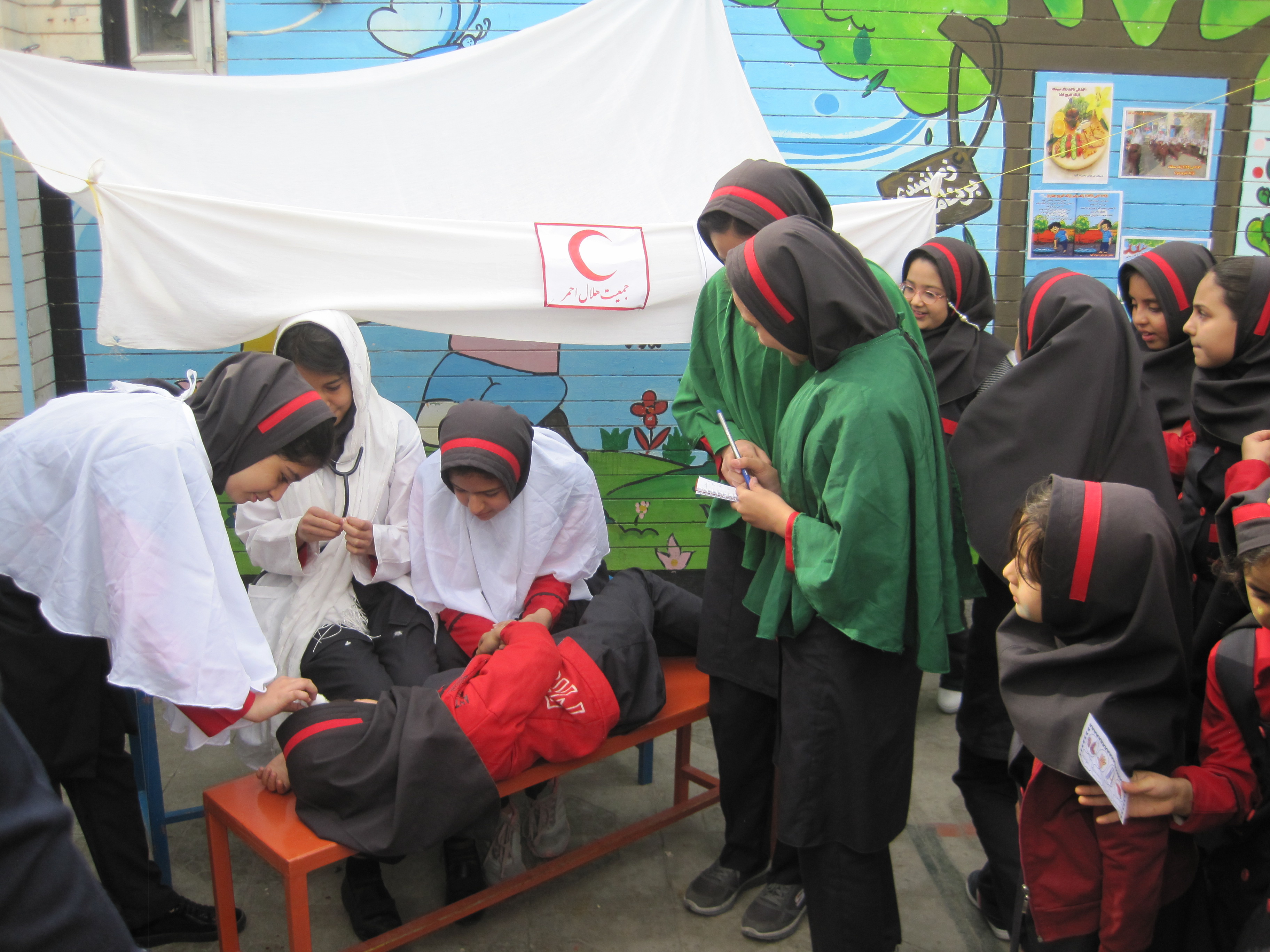 * برپايي نمادين چادر هلال احمر و استفاده از كمك هاي اوليه